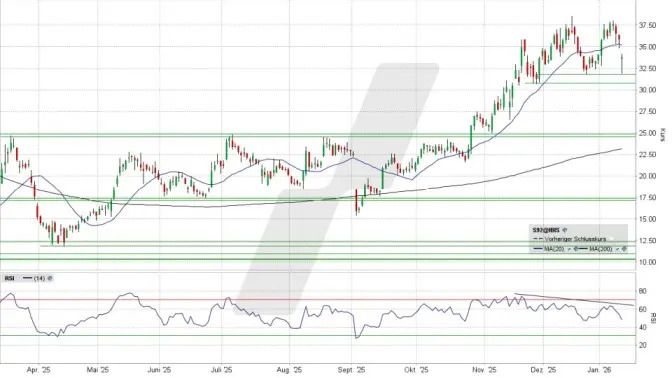 Hätte die Aktie des Solar-Wechselrichterherstellers SMA Solar nicht genau an der Nackenline der Formation wieder leicht nach oben gedreht, wäre am Dienstag ein Doppeltopp vollendet worden. Doch noch ist das Risiko, dass diese Formation die Hausse beendet, nicht vom Tisch.......