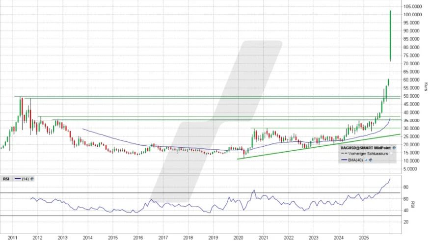 Gold fehlten am Freitag nur zehn US-Dollar zur „magischen Marke“ von 5.000 US-Dollar … aber Silber hat seine runde Marke jetzt erreicht und überboten: Mit über 100 US-Dollar ging das Edelmetall zu einem Preis ins Wochenende, der unglaublich wirkt … und hochriskant ist.…..............