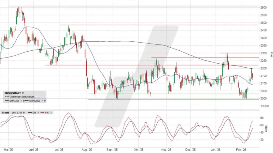 Die Hermès-Aktie befindet sich seit August in einer Bodenbildung. Es gab mehrere Versuche, eine Aufwärtswende zu generieren, bislang wurden aber alle abgefangen. Die 2025er-Bilanz des Donnerstags hätte eine weitere Chance sein können. Doch die ließen die Bullen liegen..…..............