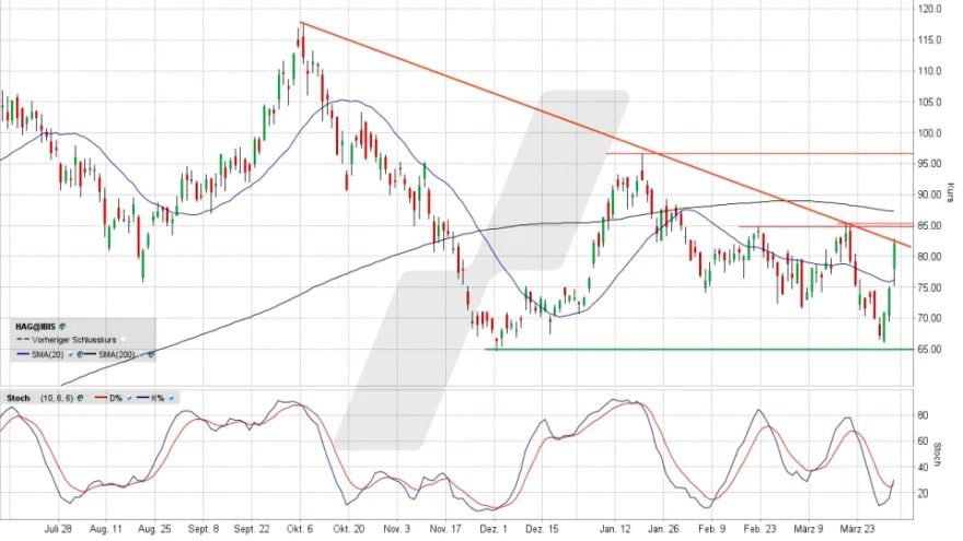 Zum Wochenstart zog Hensoldt deutlich an. Drei Tage kräftig steigende Kurse nach einem Aufwärtsschwenk über einer wichtigen Unterstützung, das sieht vielversprechend aus für das bullische Lager. Aber noch ist der übergeordnete Abwärtstrend nicht bezwungen.......