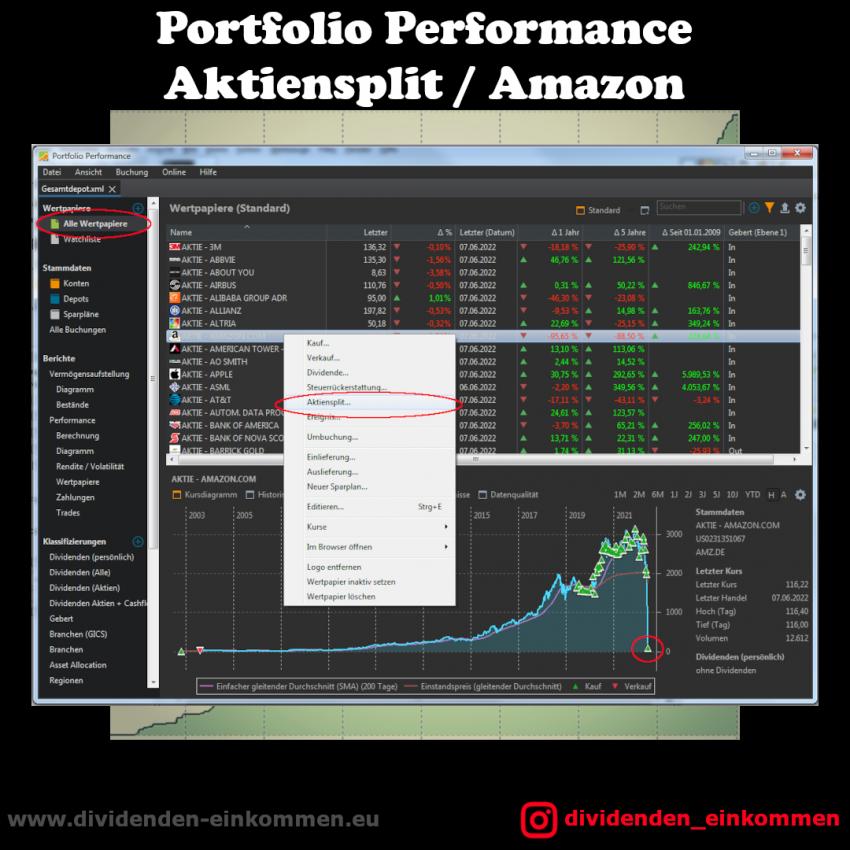 Auf "Amazon" klicke ich dann mit der rechten Maustaste, um das Kontextmenü zu öffnen und wähle dort "Aktiensplit" aus.